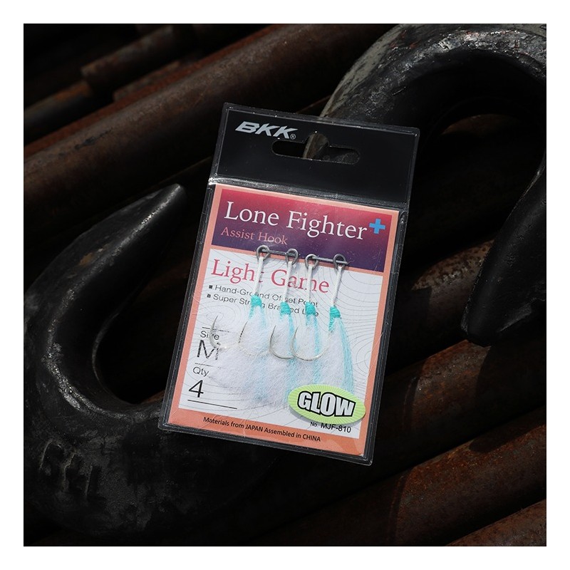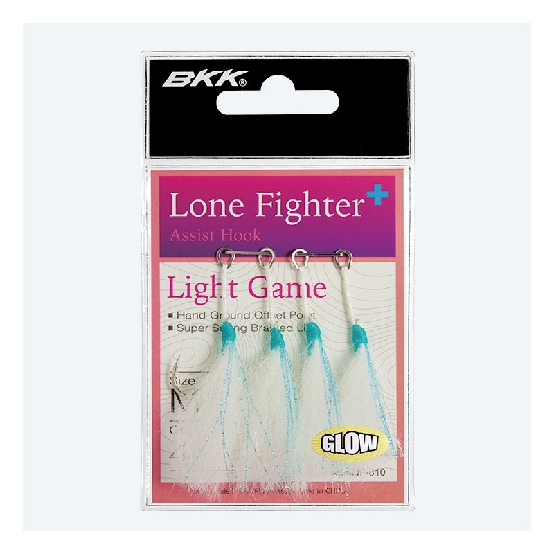 BKK Lone Fighter + este un cârlig care se ataseaza special pentru jigging, conceput pentru aplicații ușoare de jigging cu jiguri mici și rapide variind de la 10 la 50 g. atât din barca, cât și de pe mal. Se pot atasa si la voblere, crescand astfel atractia momelii.