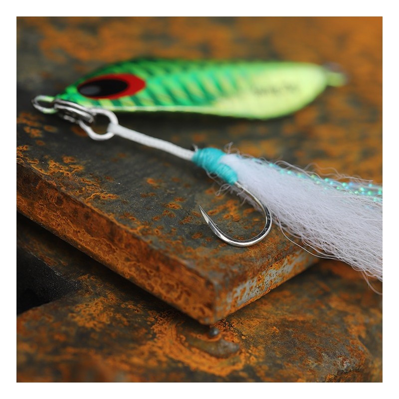 De asemenea, au un tratament special aplicat de suprafata care oferă o rezistență excelentă la coroziune în apă sărată chiar și în medii dure. Cârligul de asistență are atasate fibre naturale și strălucitoare, adăugând putere de atracție fantastica, declanșând astfel mai multe atacuri in momente dificile in care pestii nu sa hranesc bine.