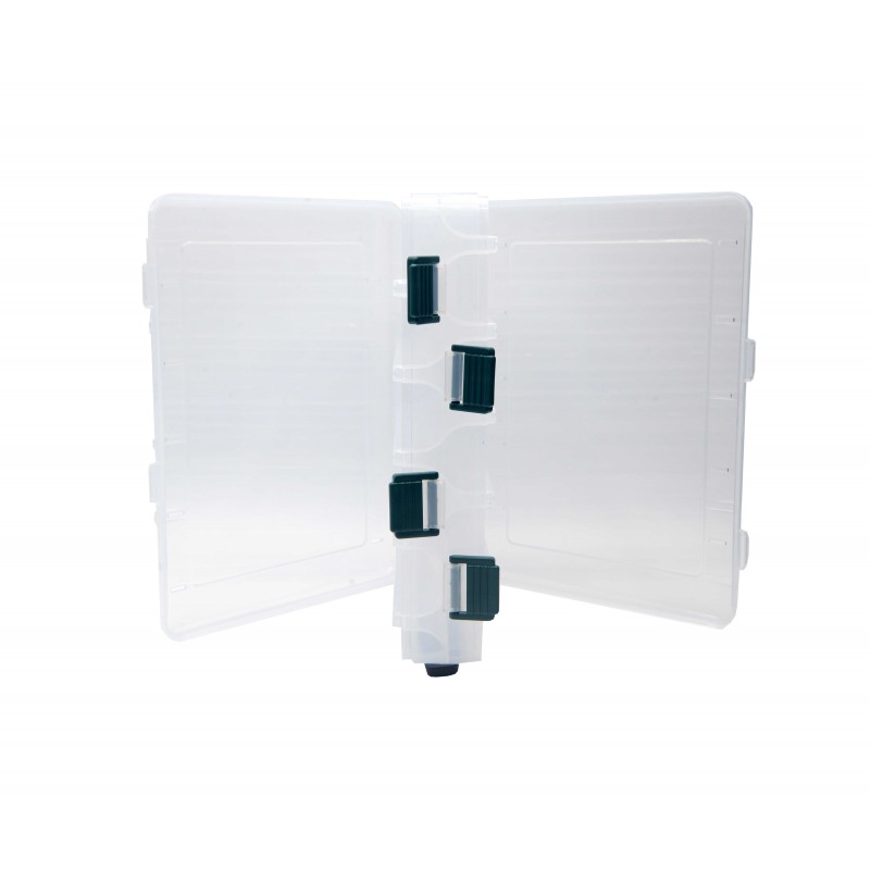 Cutie fabricata din plastic, transparenta. Recomandata pentru depozitarea voblerelor, linguritelor, oscilantelor etc. Cutia are deschidere dubla, fiind foarte practica si usor de accesat iar capacul transparent faciliteaza alegerea momelii dorite intr-o maniera rapida. Fiecare compartiment din cele 10+2, are orificii speciale pentru evacuarea eventualelor urme de apa dupa momeli, rezultate dupa utilizare. Dispune de un sistem de inchidere etans, prevazut cu doua clapete din plastic rigid, foarte rezistent la manipulari repetate si maner cauciucat pentru transport. Dimensiunile compartimentelor sunt: 16x3x5cm (14 compartimente)