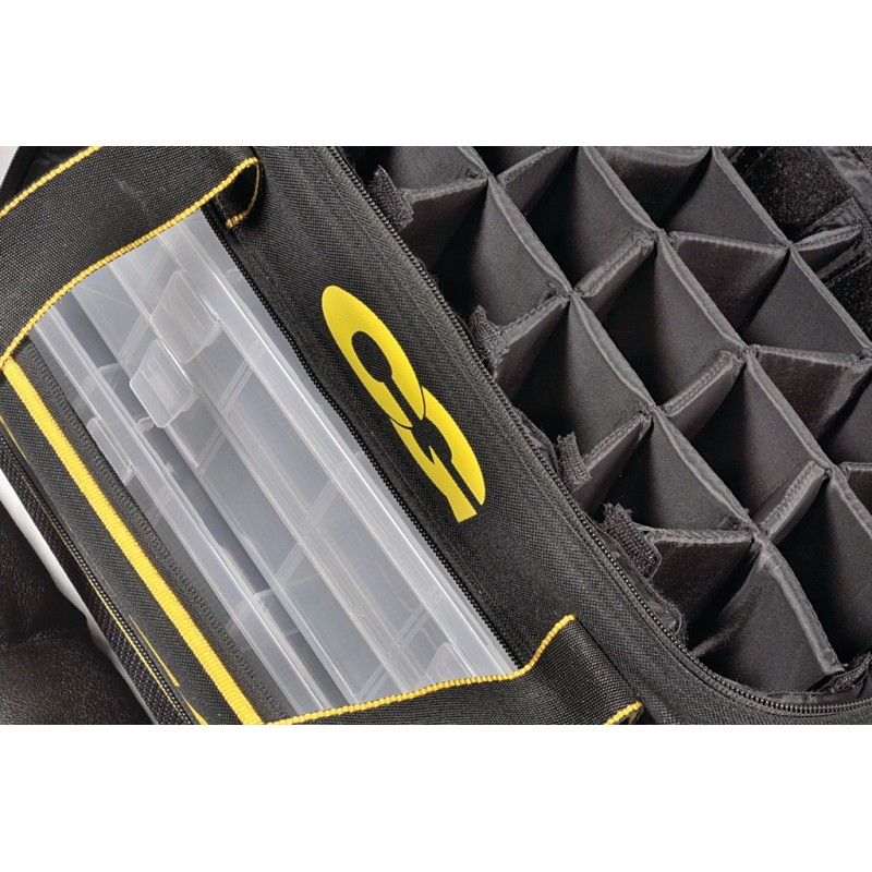 Geanta este bine structurata cu, cutii incluse pentru accesorii, monturi sau voblere,foarte rezistenta astfel incat sa putem s-o folosim o perioada lunga de timp.Cureaua de umar este captusita astfel incat sa fie comoda in miscare si sa putem transporta accesorii grele necesare la pescuitul somnului,fara efort mare.
