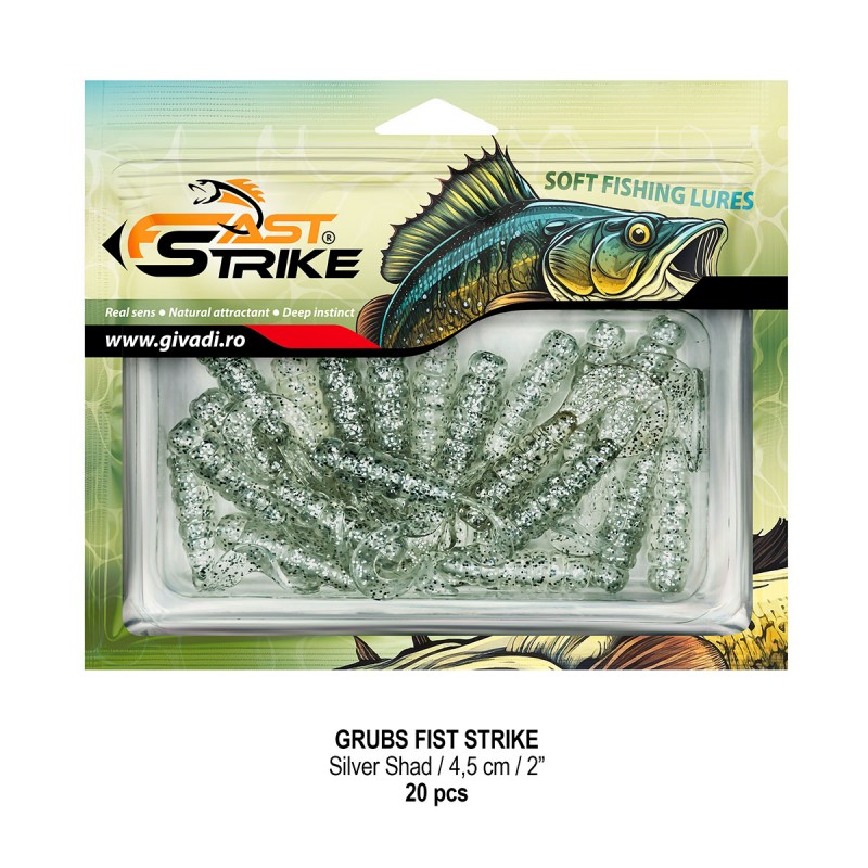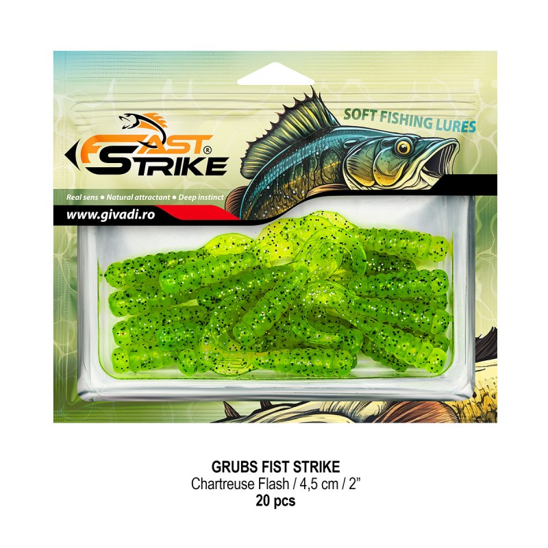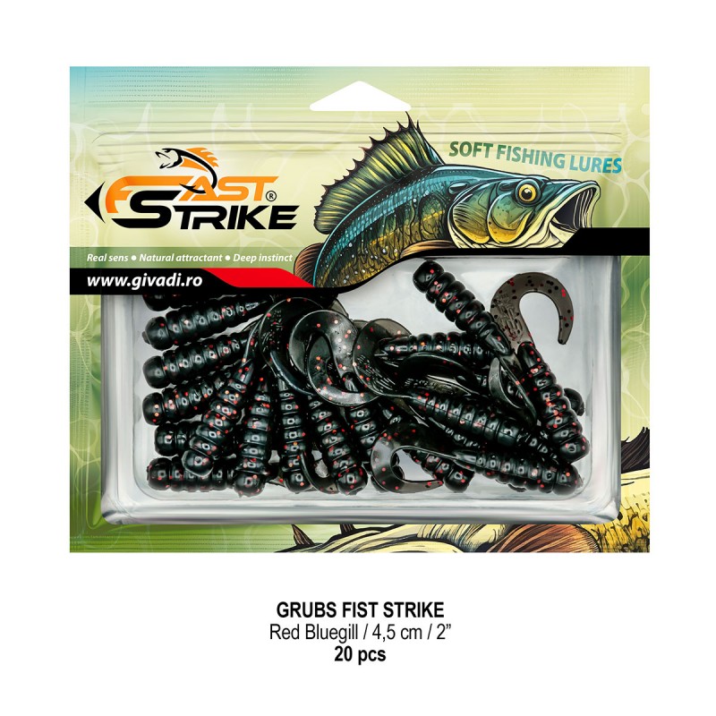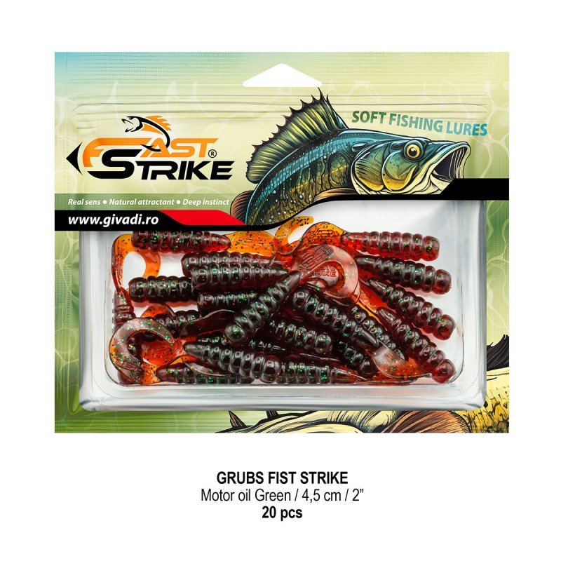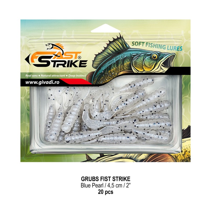 Impregnate cu un nou miros atractiv personalizat, exclusiv pentru Fast Strike, momelile vin prezentate in blistere cu fermoar, in tavite de plastic rigide pentru o pastrare cat mai buna in timpul transportului, astfel incat forma corpului sa nu capete deformari, care ar deteriora evolutia in momentul utilizari.
