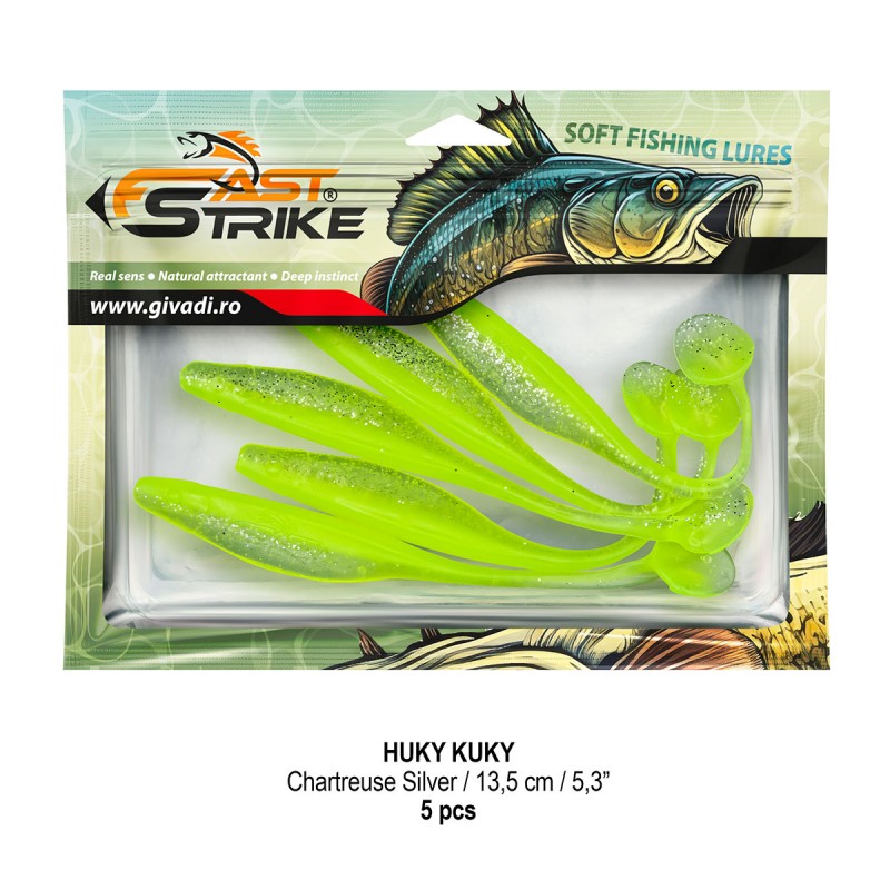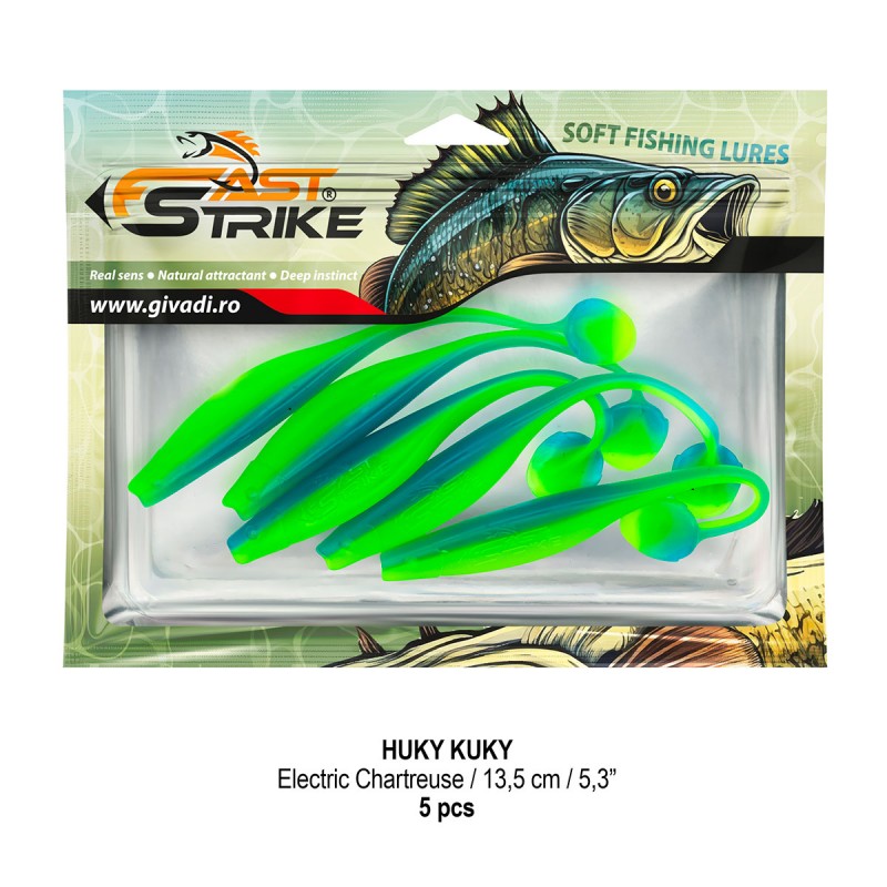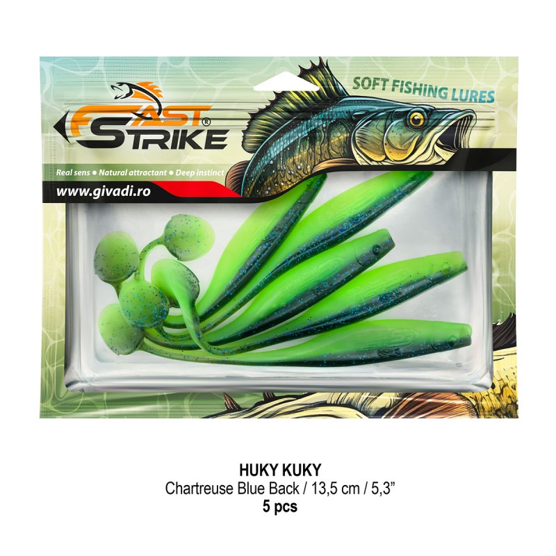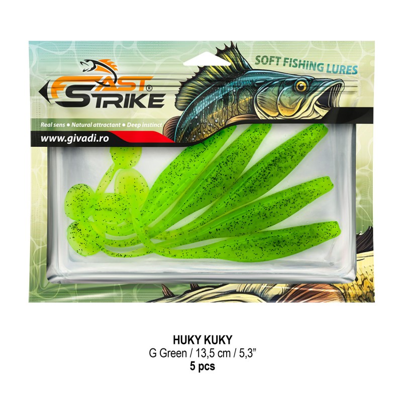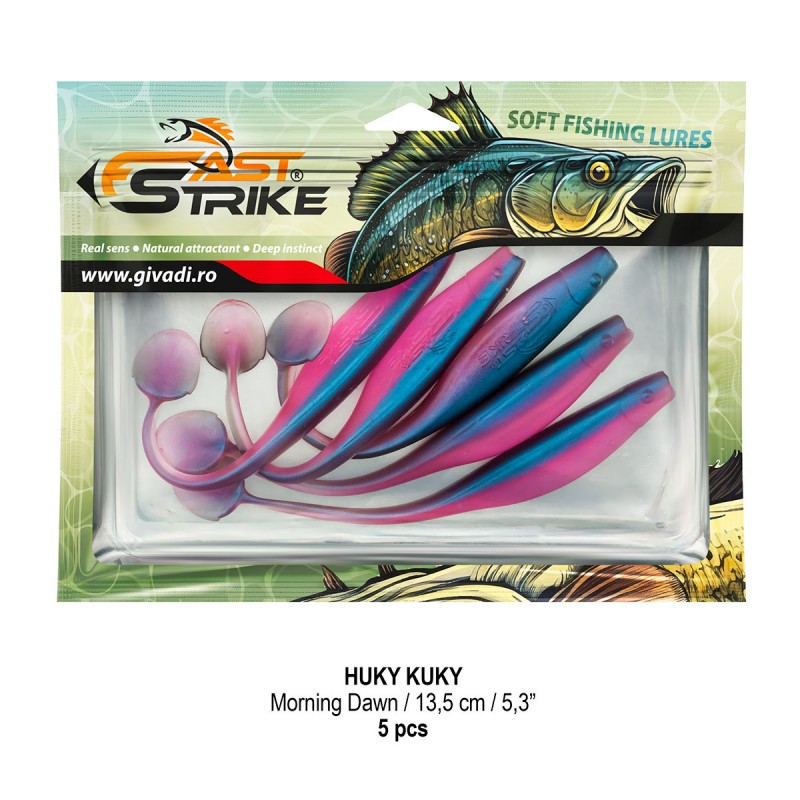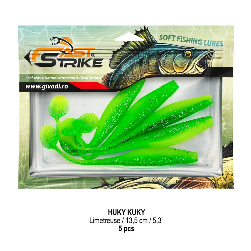 Huky Kuky este o naluca soft, extrem de atractiva ce dispune de un design special al corpului. Coada lunga si subtire joaca un rol important in ceea ce priveste nivelul de atractivitate si vibratie al nalucii, aceasta oferind in timpul recuperarii miscari irezistibile si vibratii atractive care incita rapitorul sa atace.