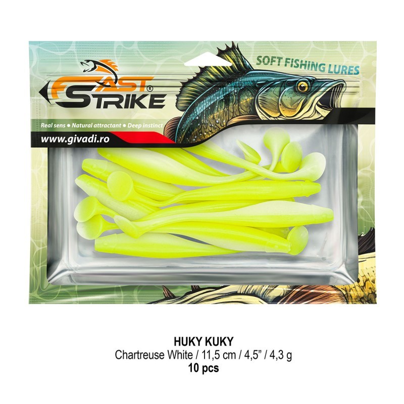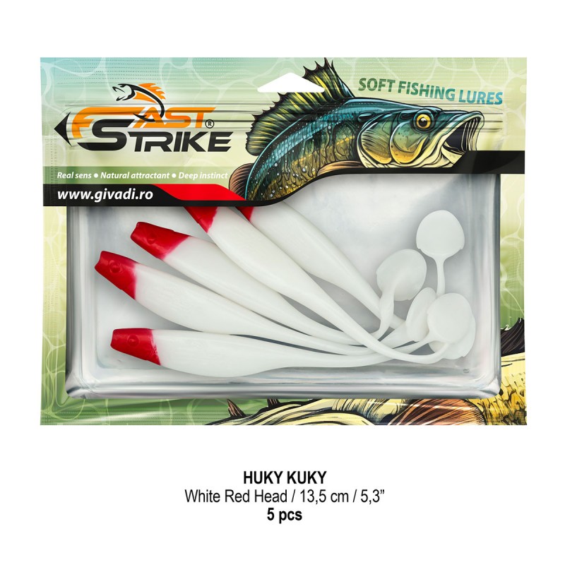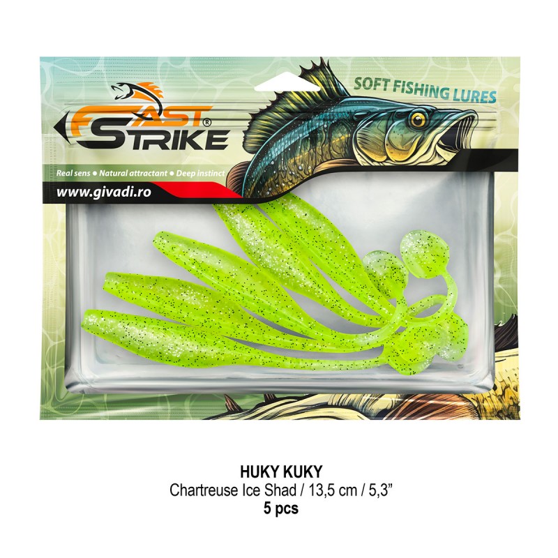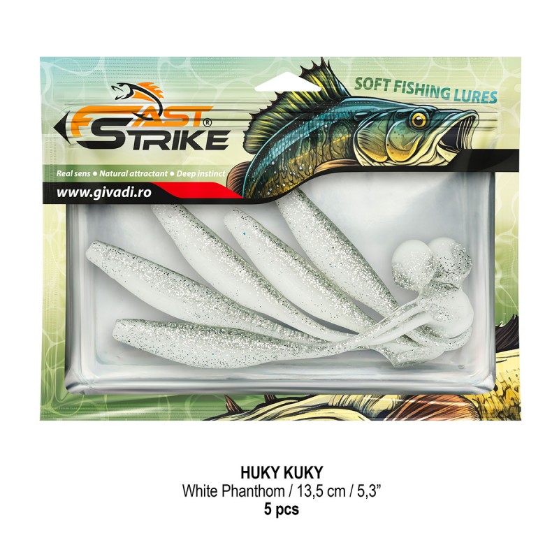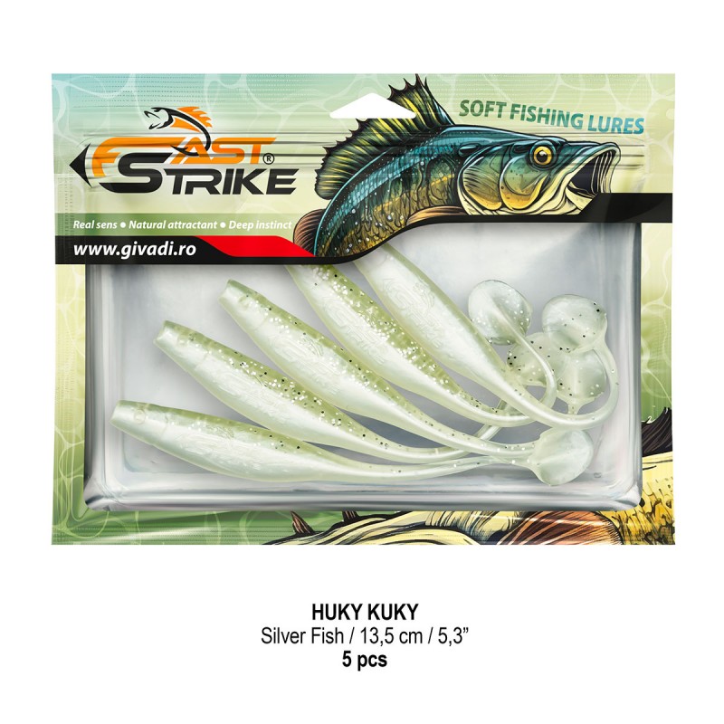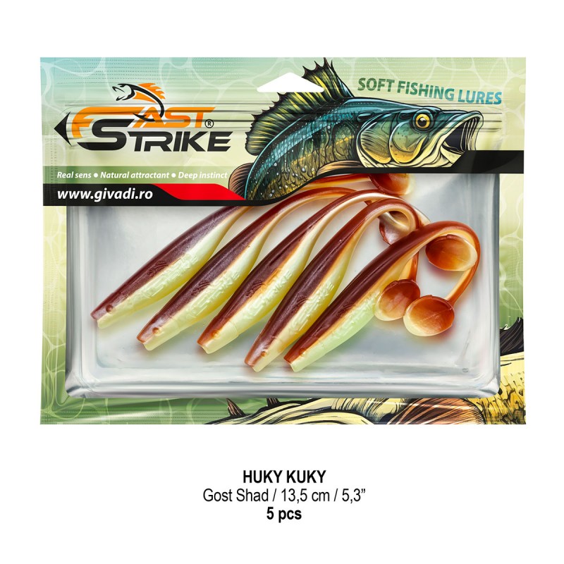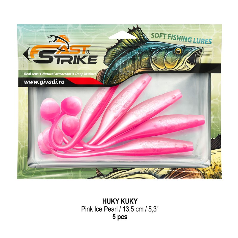 Huky Kuky este o naluca soft, extrem de atractiva ce dispune de un design special al corpului. Coada lunga si subtire joaca un rol important in ceea ce priveste nivelul de atractivitate si vibratie al nalucii, aceasta oferind in timpul recuperarii miscari irezistibile si vibratii atractive care incita rapitorul sa atace.