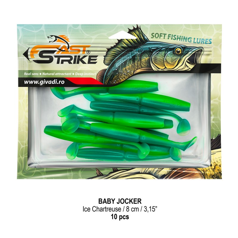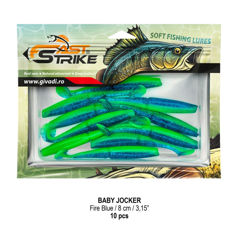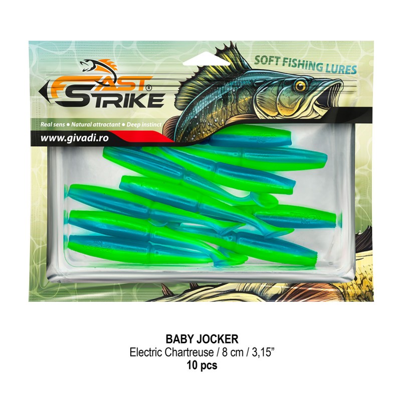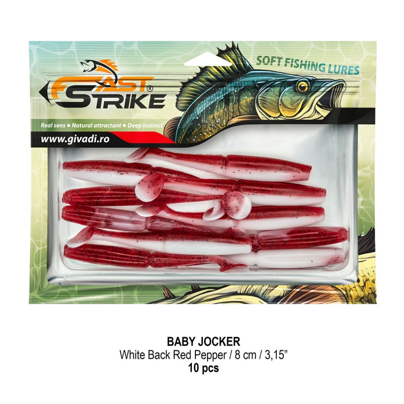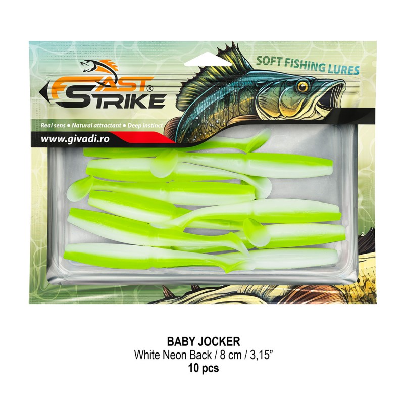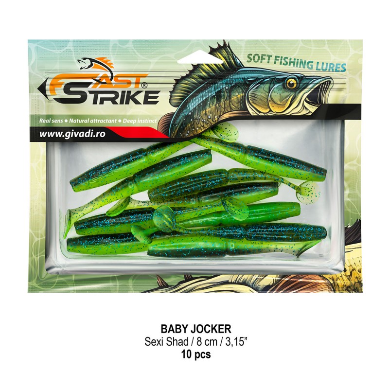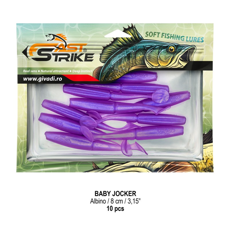 Baby Jocker este o naluca soft, extrem de atractiva ce dispune de un design special al corpului fiind segmentat in partea de mijloc pentru o evolutie naturala si o vibratie apropiata de cea a pestilor prada din mediul natural. Produs intr-o gama variata de culori, atat simple, cat si in combinatii stralucitoare, este o naluca, care functioneaza tot timpul anului atat la capturarea salaului cat si a stiucii, iar bonusurile de somn nu sunt excluse.