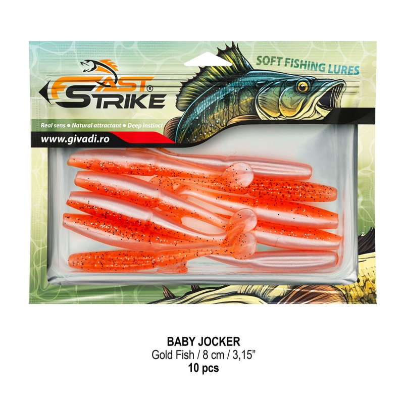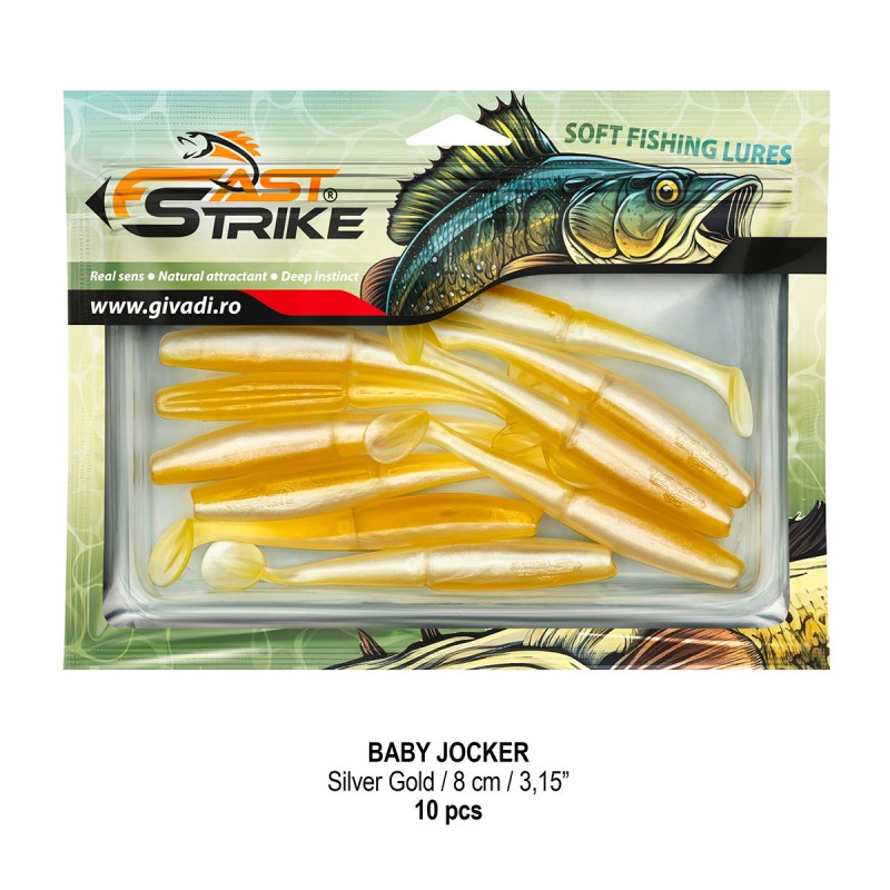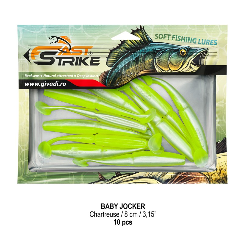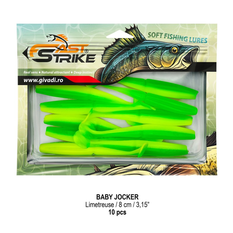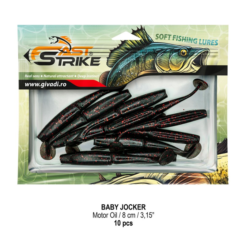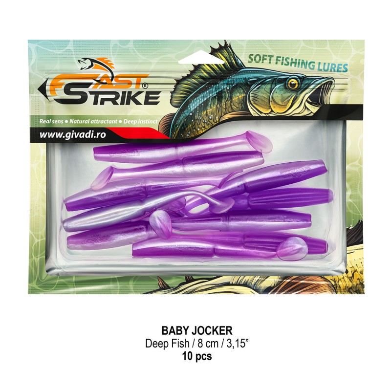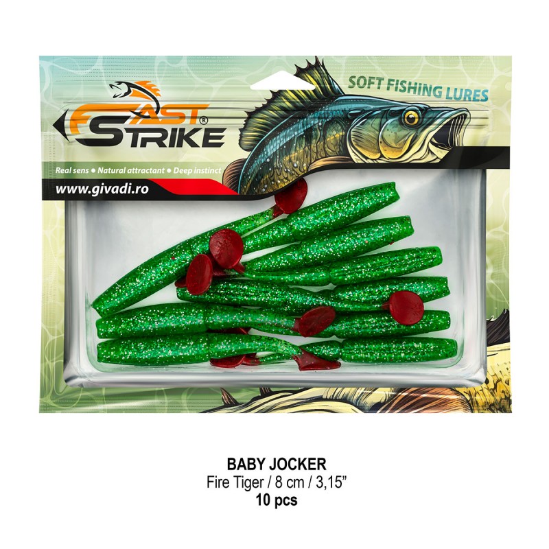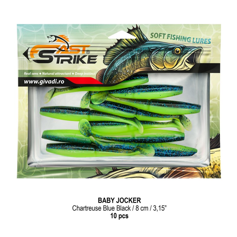 Baby Jocker este o naluca soft, extrem de atractiva ce dispune de un design special al corpului fiind segmentat in partea de mijloc pentru o evolutie naturala si o vibratie apropiata de cea a pestilor prada din mediul natural. Produs intr-o gama variata de culori, atat simple, cat si in combinatii stralucitoare, este o naluca, care functioneaza tot timpul anului atat la capturarea salaului cat si a stiucii, iar bonusurile de somn nu sunt excluse.