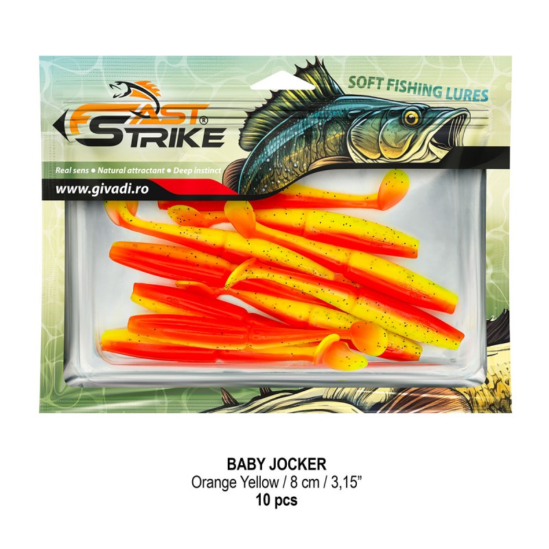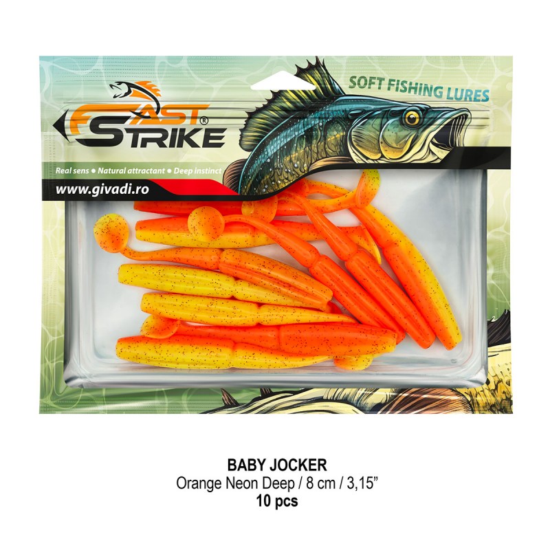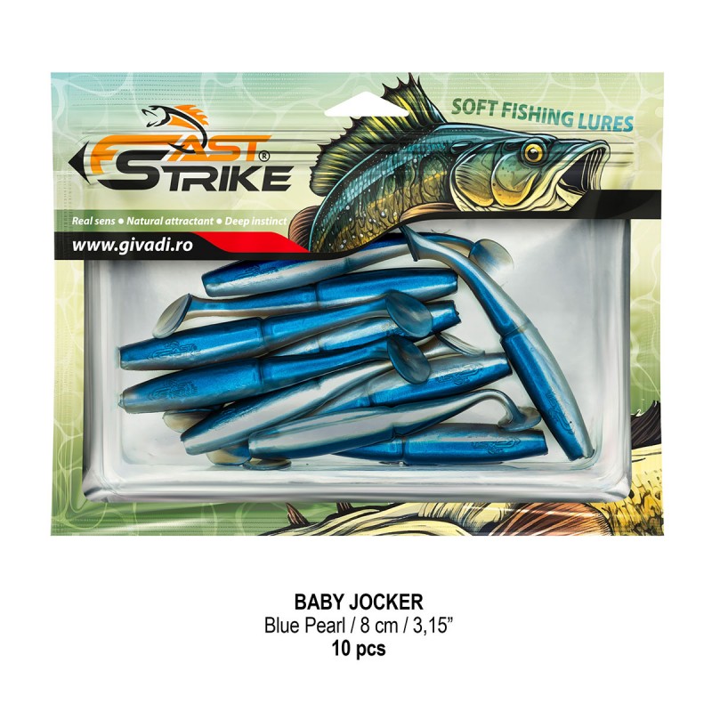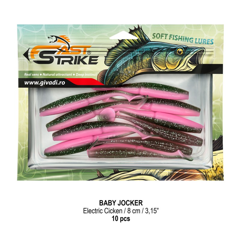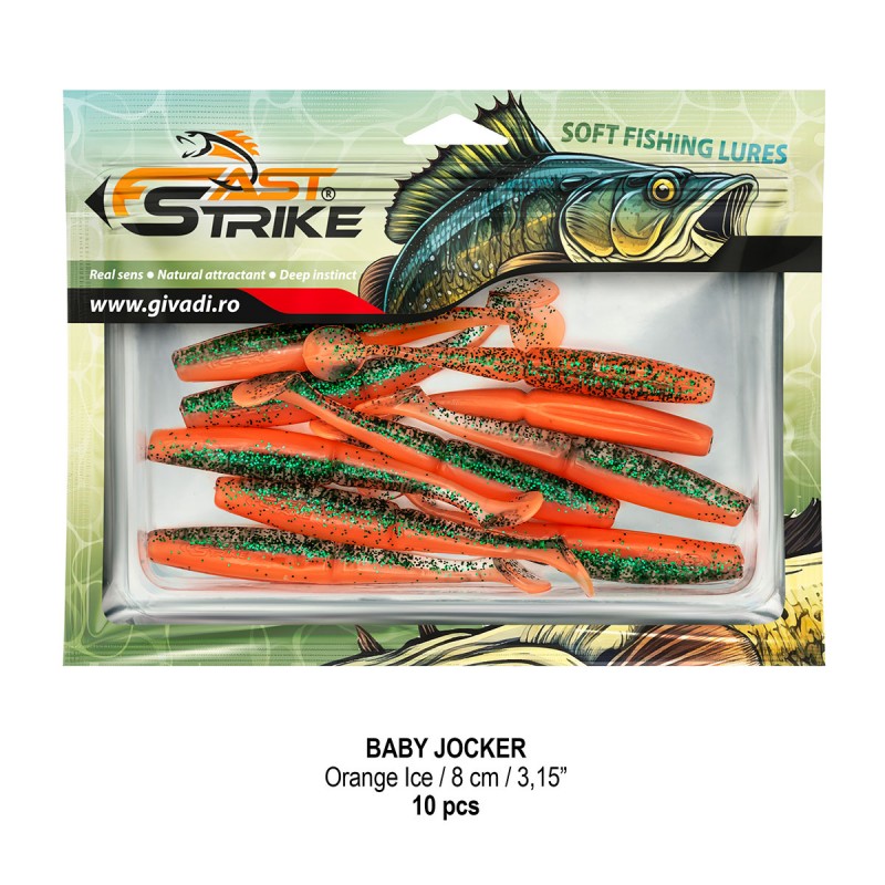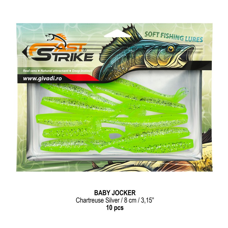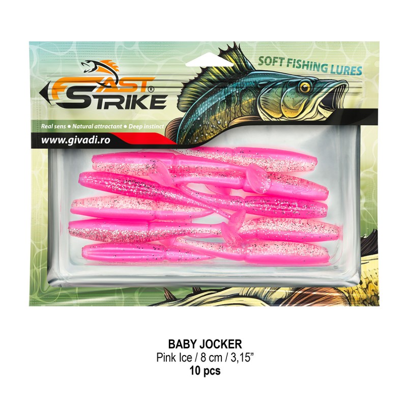 Baby Jocker este o naluca soft, extrem de atractiva ce dispune de un design special al corpului fiind segmentat in partea de mijloc pentru o evolutie naturala si o vibratie apropiata de cea a pestilor prada din mediul natural. Produs intr-o gama variata de culori, atat simple, cat si in combinatii stralucitoare, este o naluca, care functioneaza tot timpul anului atat la capturarea salaului cat si a stiucii, iar bonusurile de somn nu sunt excluse.